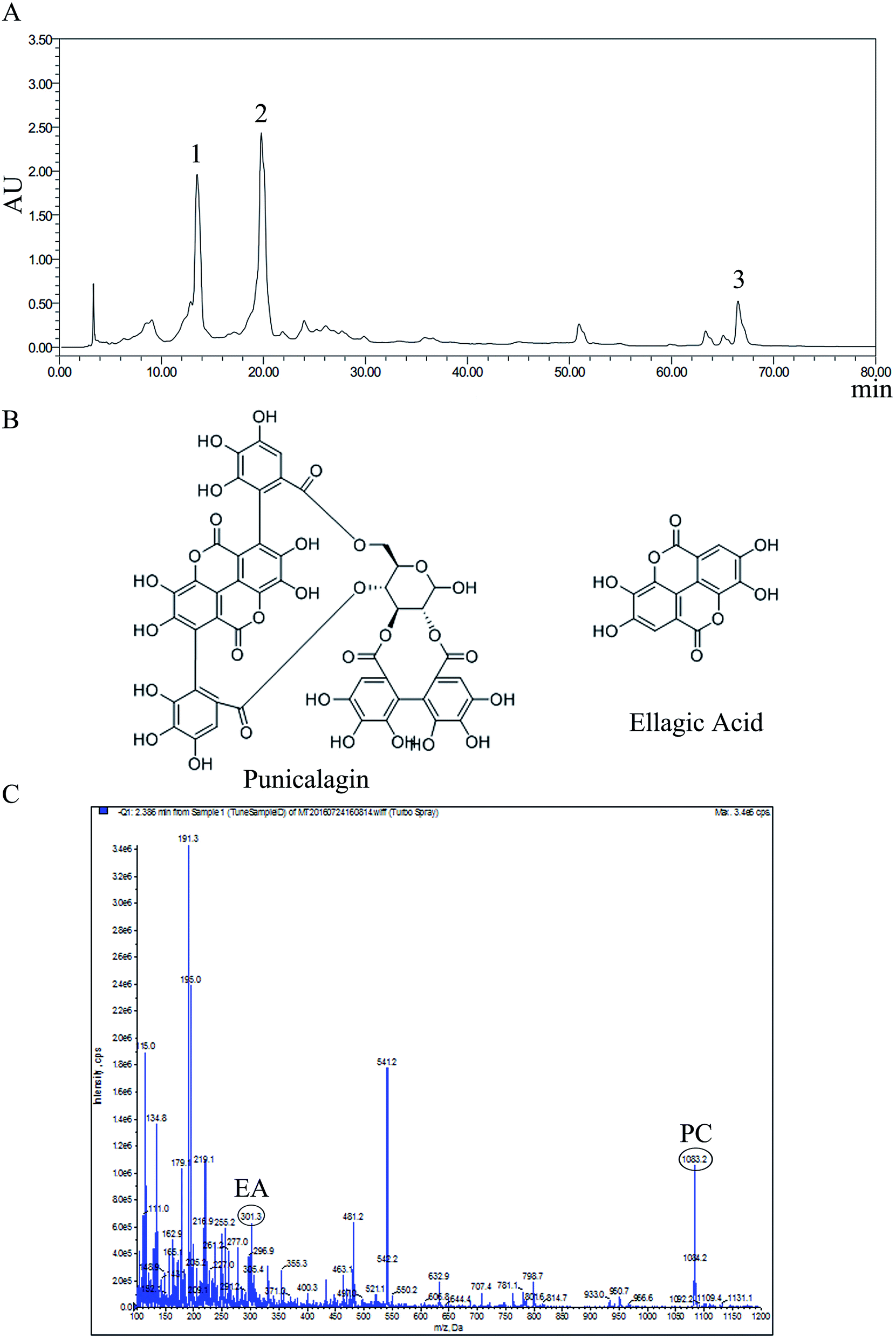 Rajah 1 HPLC dan MS. (A) Kromatogram PoPx, PC (puncak 1 dan puncak 2) dan EA (puncak 3). (B) Struktur kimia PC dan EA. (C) Berat molekul EA (asid ellagic [M – H] -: 301.3) dan PC (punicalagin [M – H] -: 1083.2).