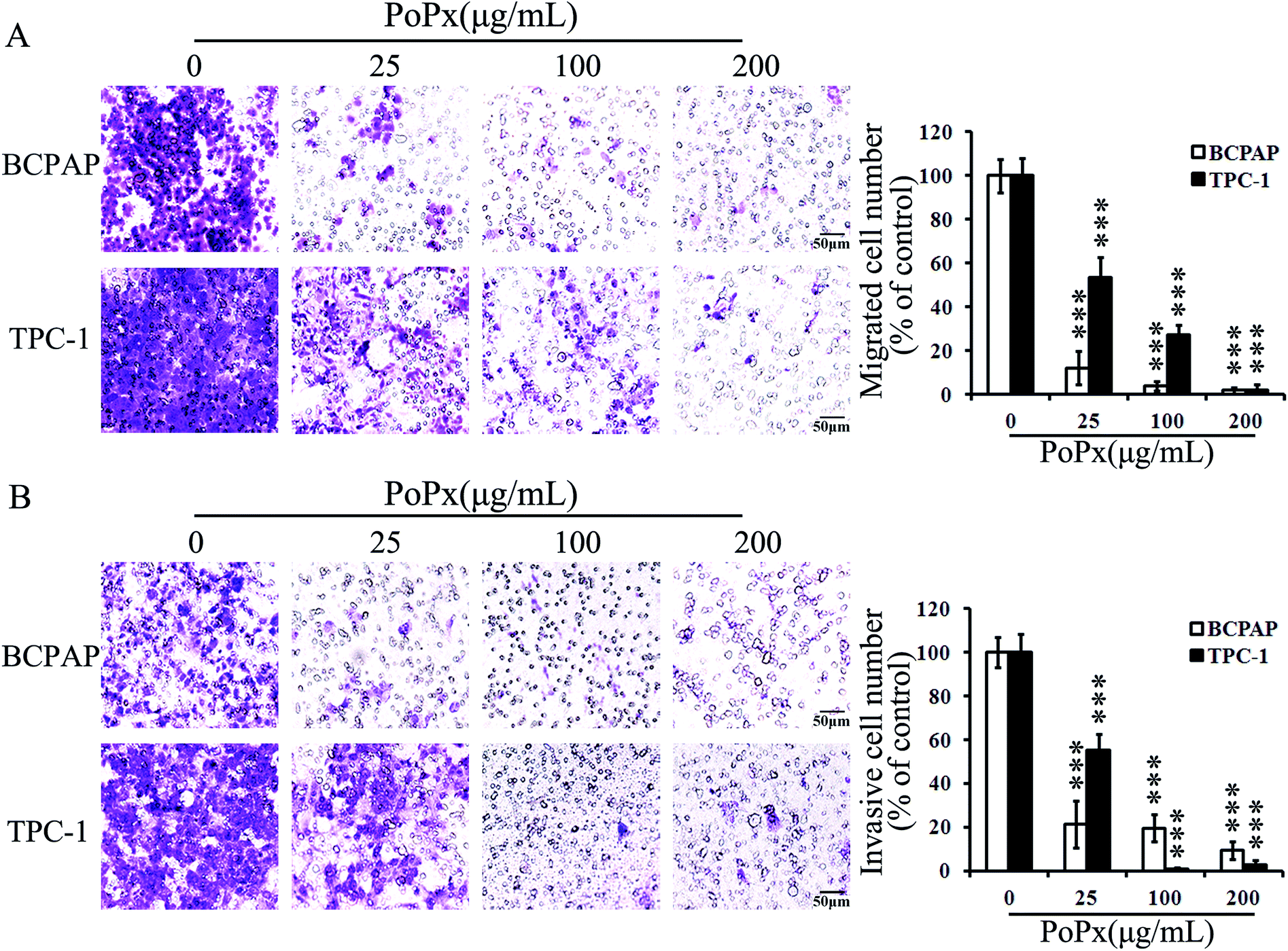 Kami melakukan ujian migrasi transwell menggunakan talian sel BCPAP dan TPC-1. Seperti yang ditunjukkan dalam Fig. 5A, ekstrak kulit buah delima (PoPx) menghalang migrasi kedua-dua sel BCPAP dan TPC-1 dalam cara yang bergantung kepada dos. Kemudian, kami melakukan ujian pencerobohan Matrigel. Keupayaan pencerobohan kedua-dua sel BCPAP dan TPC-1 berkurangan secara signifikan dengan kehadiran ekstrak kulit buah delima (PoPx) ke atas vehicle itu, yang boleh dilihat secara jelas dalam Fig. 5B..